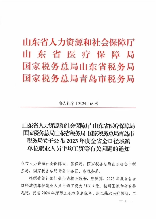 近日,山东省人力资源和社会保障厅、山东省医疗保障局、国家税务总局山东省税务局、国家税务总局青岛市税务局印发《关于公布2023年度全省全口径城镇单位就业人员平均工资等有关问题的通知》(鲁人社字〔2024〕64号),公布2023年度全省全口径城镇单位就业人员平均工资为88313元。 按照国家和省有关规定,我省2024年度职工基本养老保险、职工基本医疗保险、工伤保险、失业保险个人月缴费基数的上限为22078元,下限为4416元。